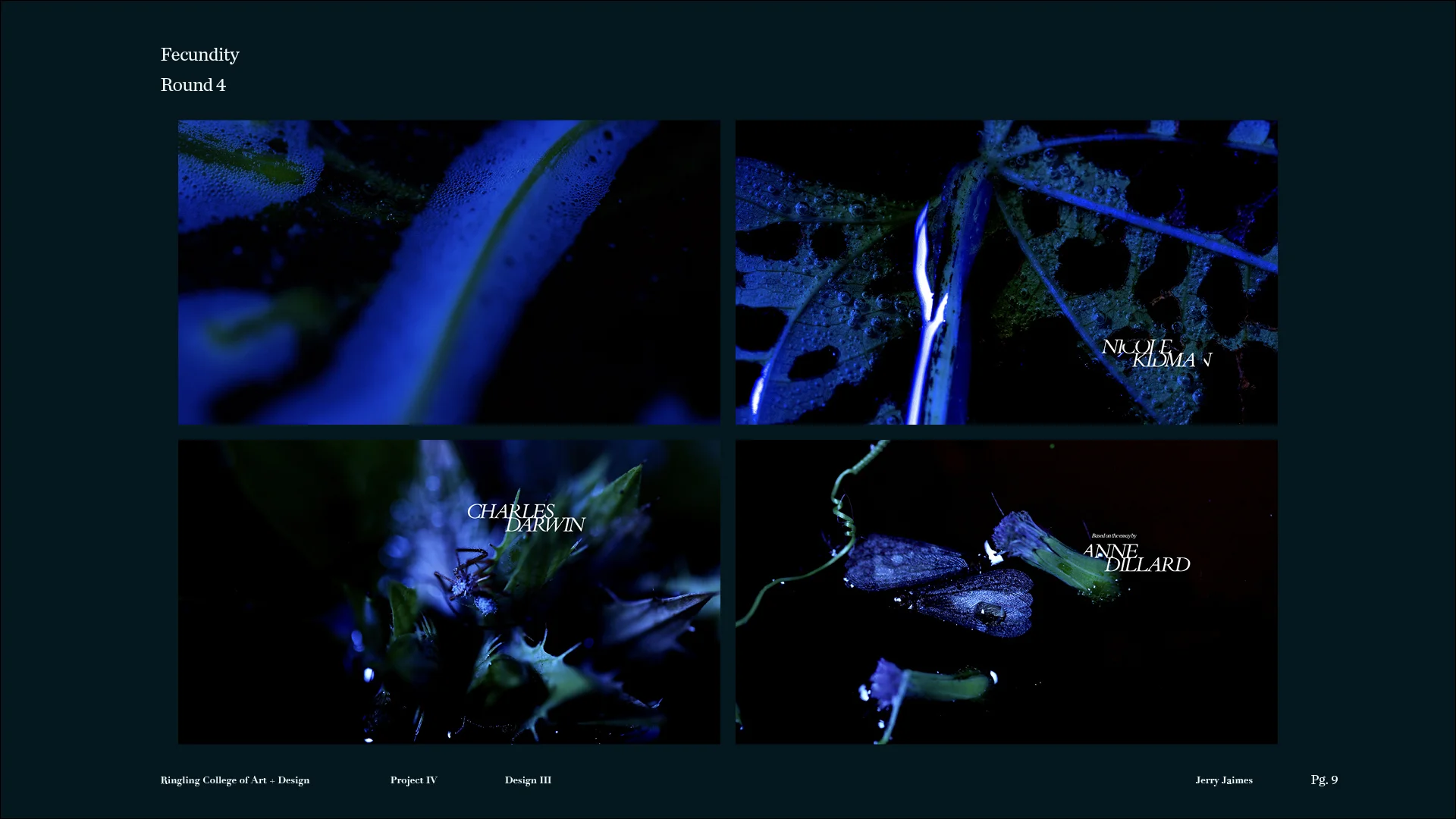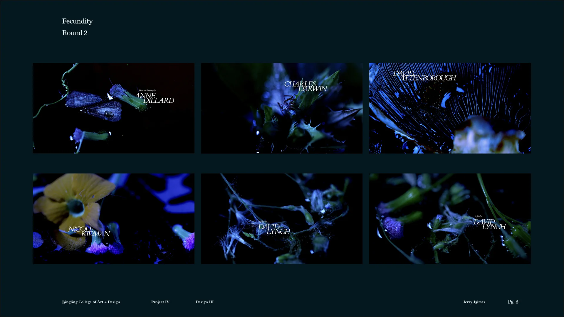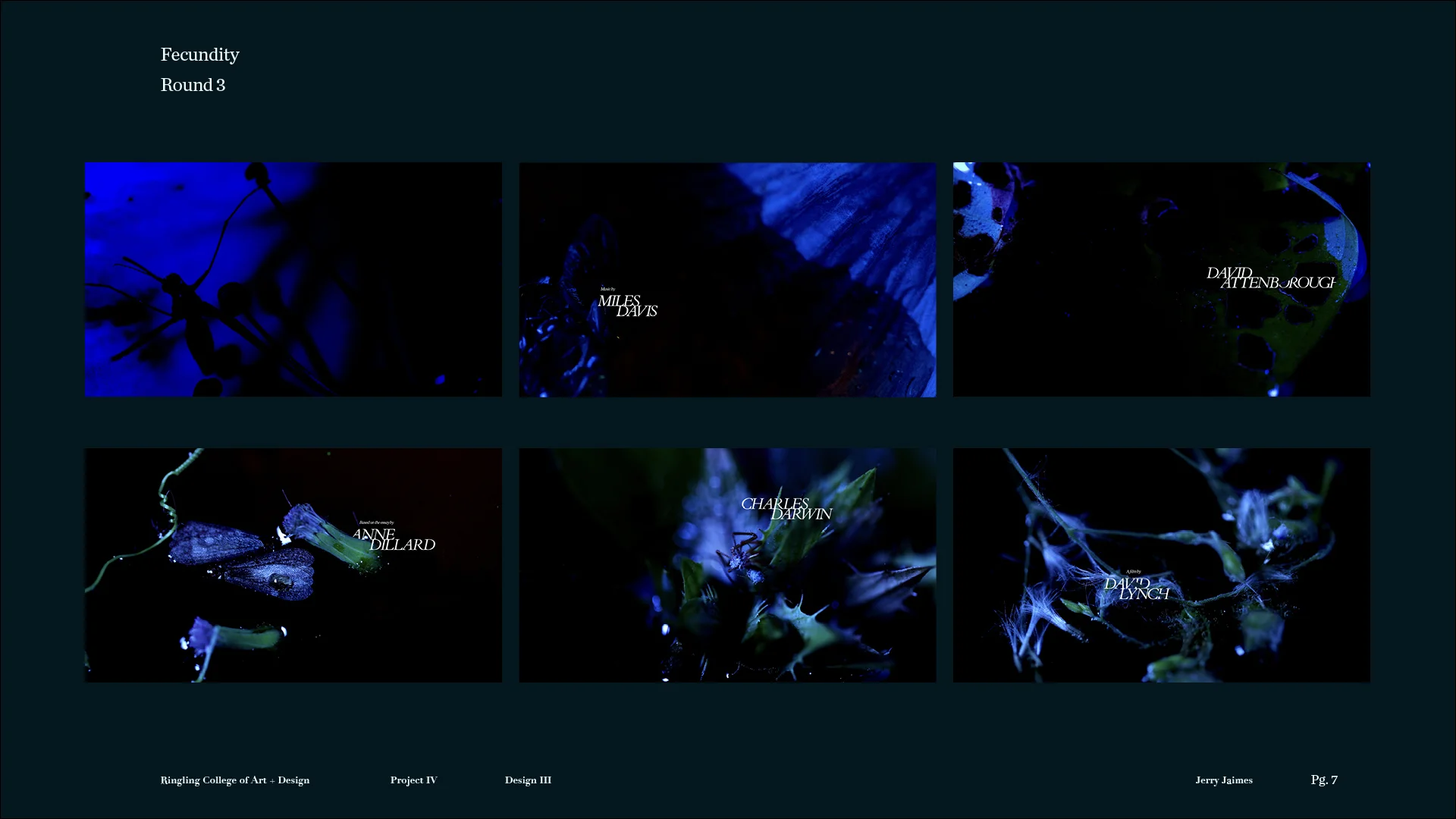 This project is a non-traditional approach to a title sequence, where there are no pre-determined storyboards, and we don’t know what the outcome will be at the start of the project. Students are asked to develop a title sequence for a text about time, nature, or technology. We begin with open-ended visual experiments that resonate with the readings, and continually refine the experiments to enhance their impact and steer the piece towards an intended mood or meaning.