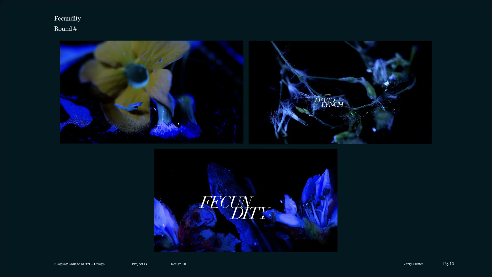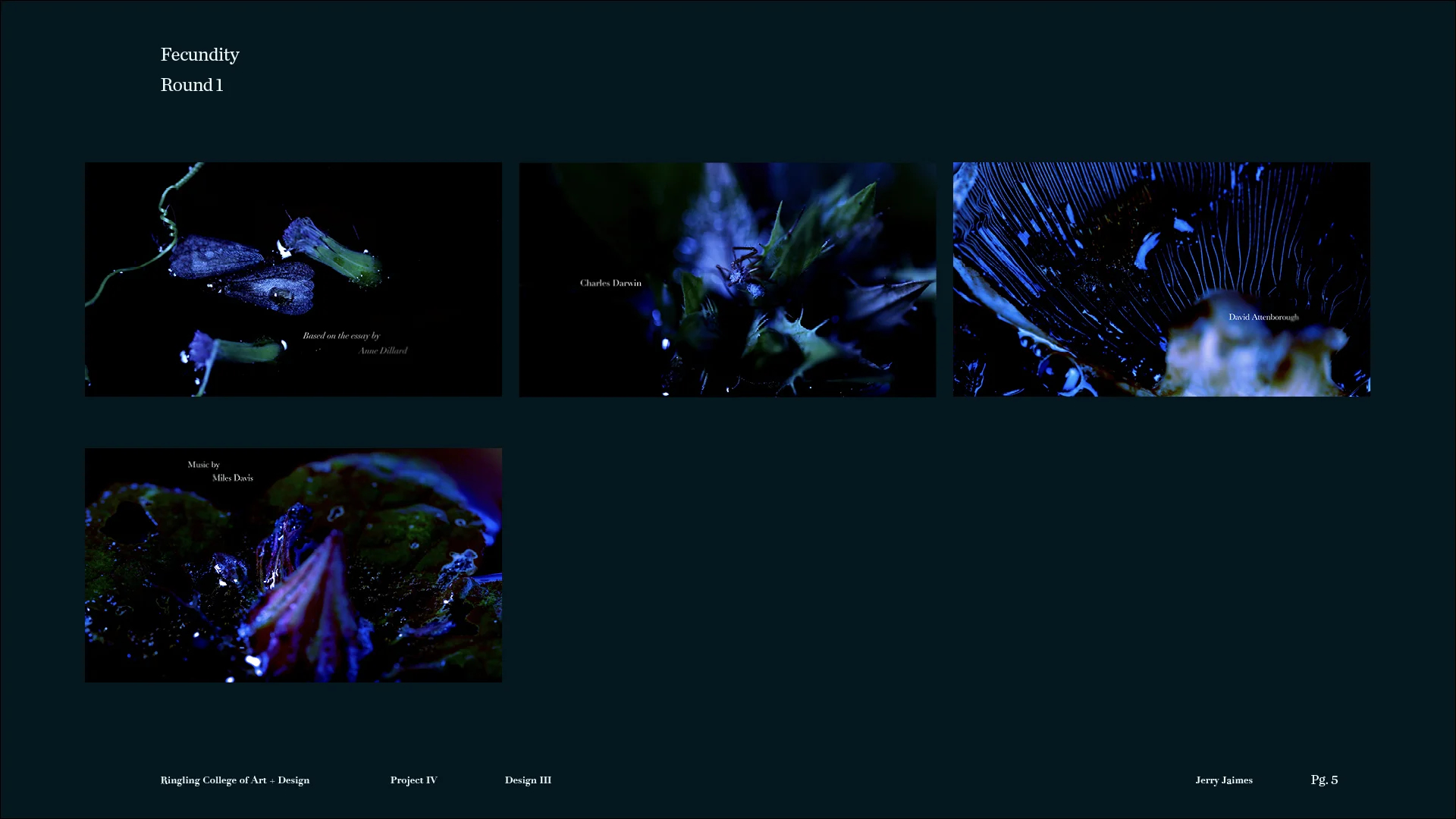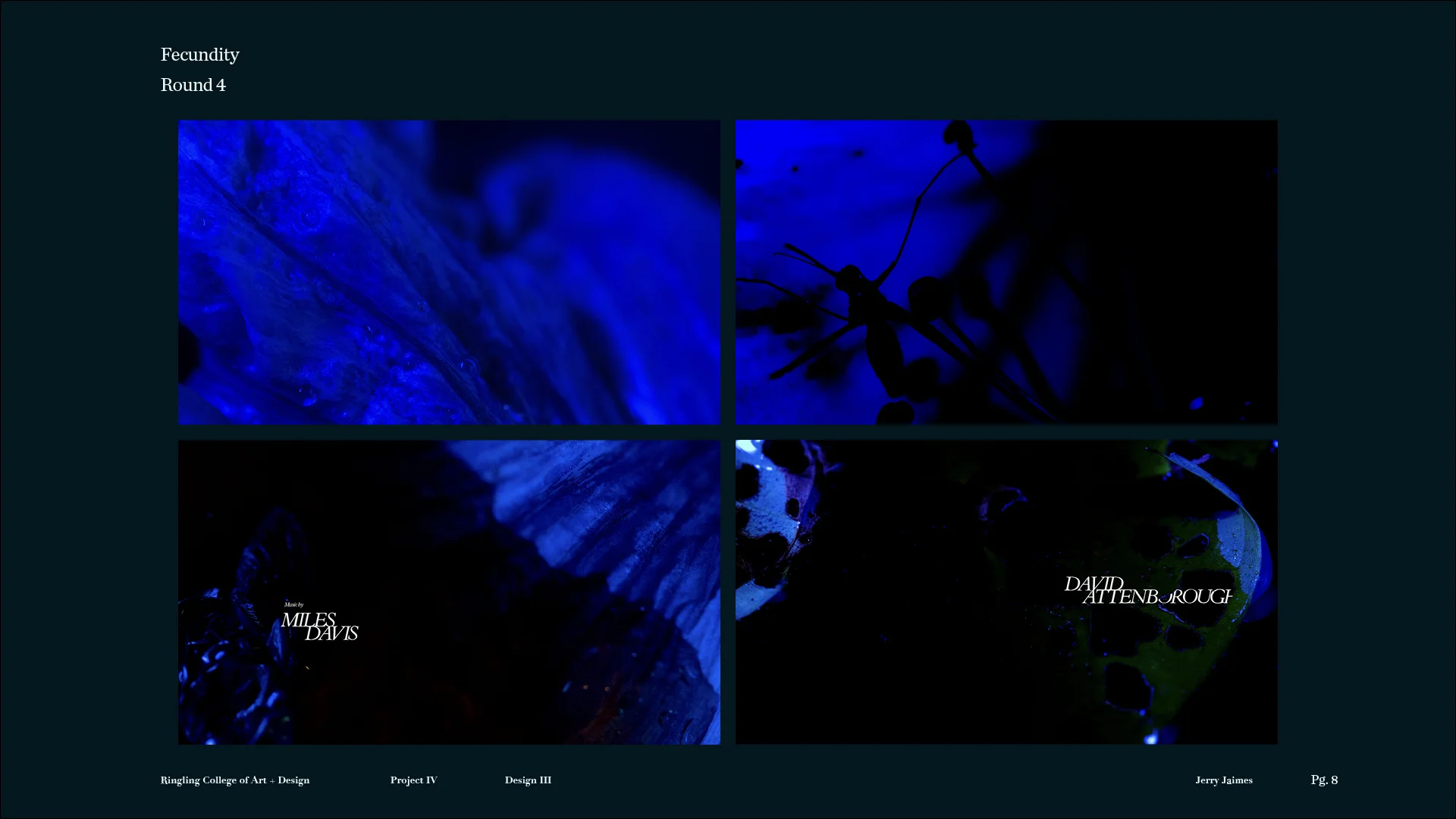 This project is a non-traditional approach to a title sequence, where there are no pre-determined storyboards, and we don’t know what the outcome will be at the start of the project. Students are asked to develop a title sequence for a text about time, nature, or technology. We begin with open-ended visual experiments that resonate with the readings, and continually refine the experiments to enhance their impact and steer the piece towards an intended mood or meaning.