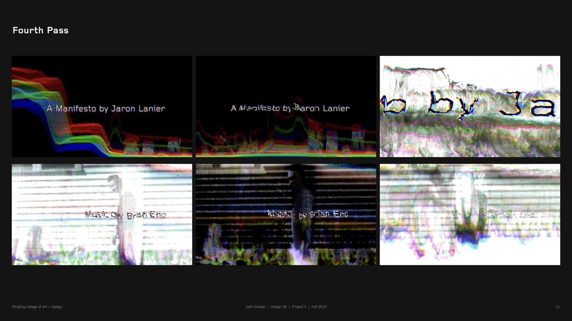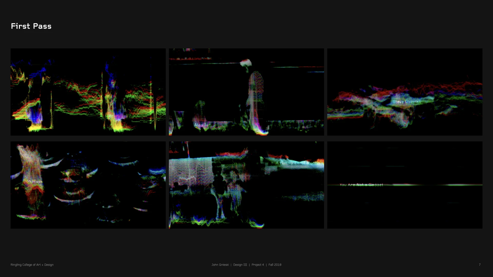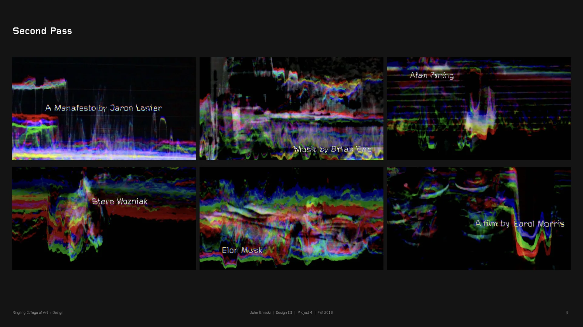 John explored the concept of computer vision and how the computer “sees” imagery. He experimented with RGB video scopes and other motion design tools in ways they were never intended to be used. He then took the output of these and further distorted the imagery.