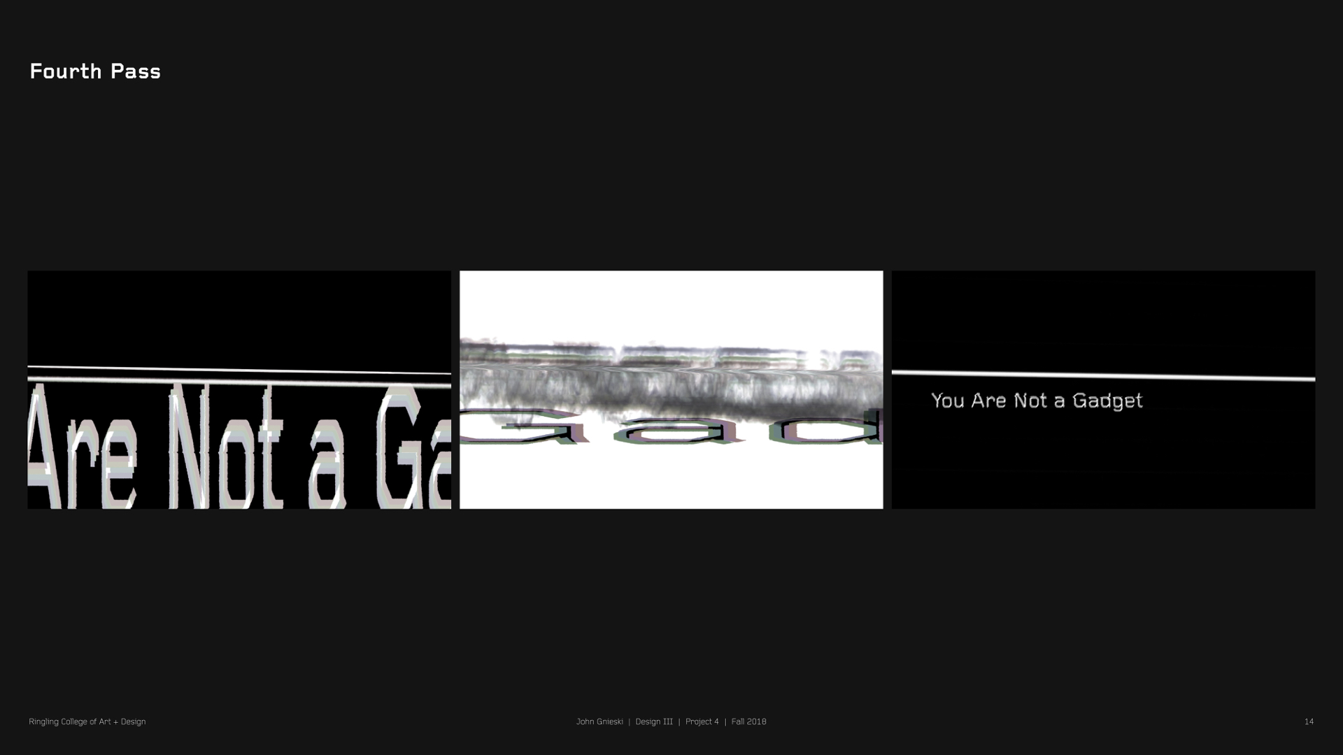This project is a non-traditional approach to a title sequence, where there are no pre-determined storyboards, and we don’t know what the outcome will be at the start of the project. Students are asked to develop a title sequence for a text about time, nature, or technology. We begin with open-ended visual experiments that resonate with the readings, and continually refine the experiments to enhance their impact and steer the piece towards an intended mood or meaning.