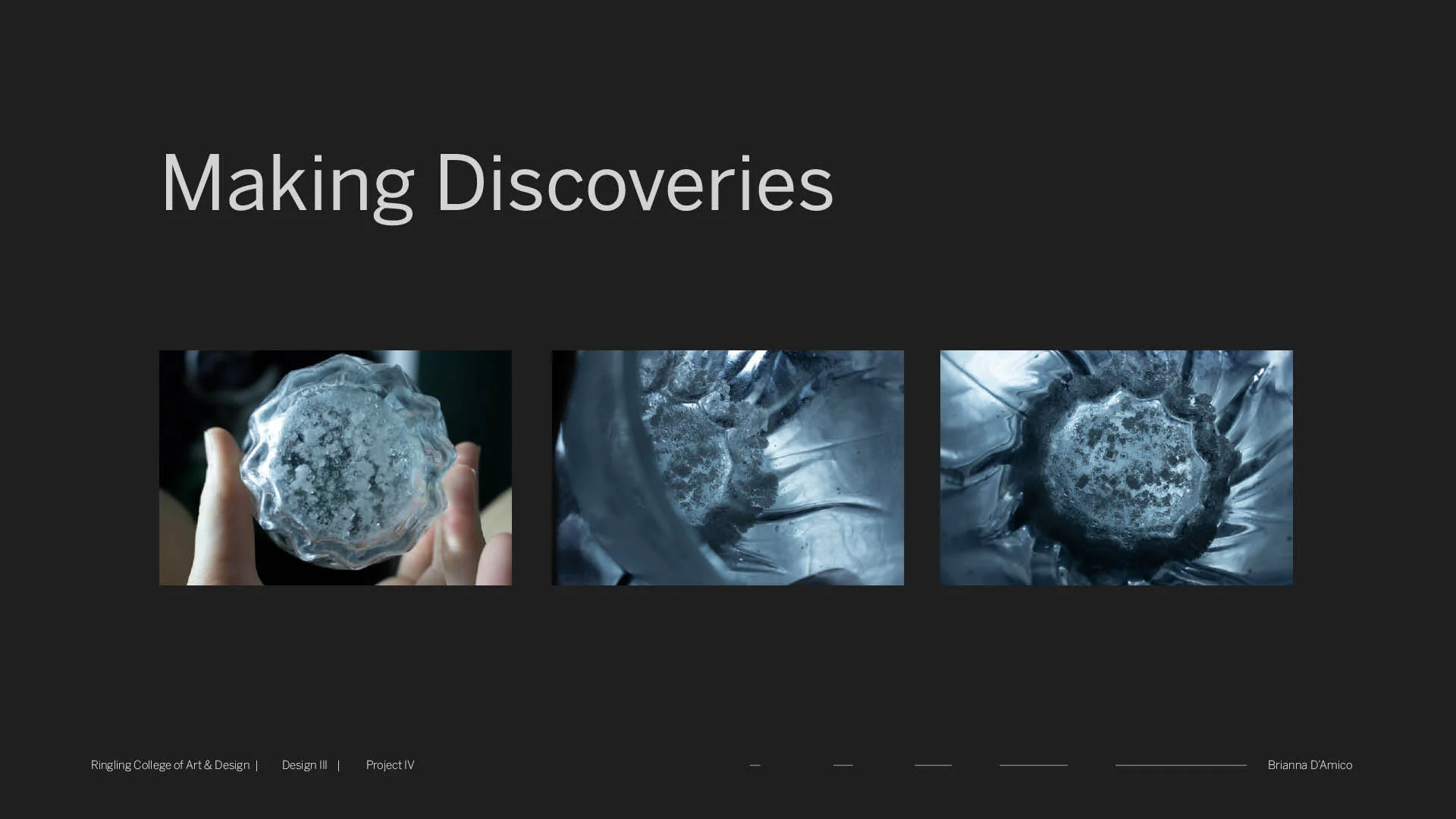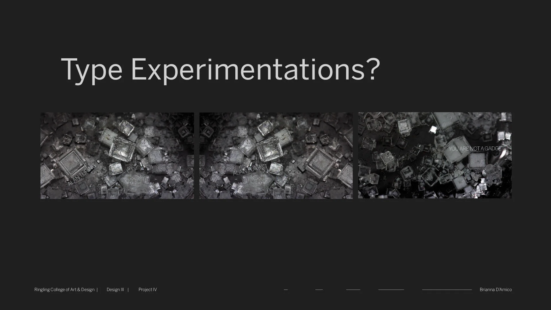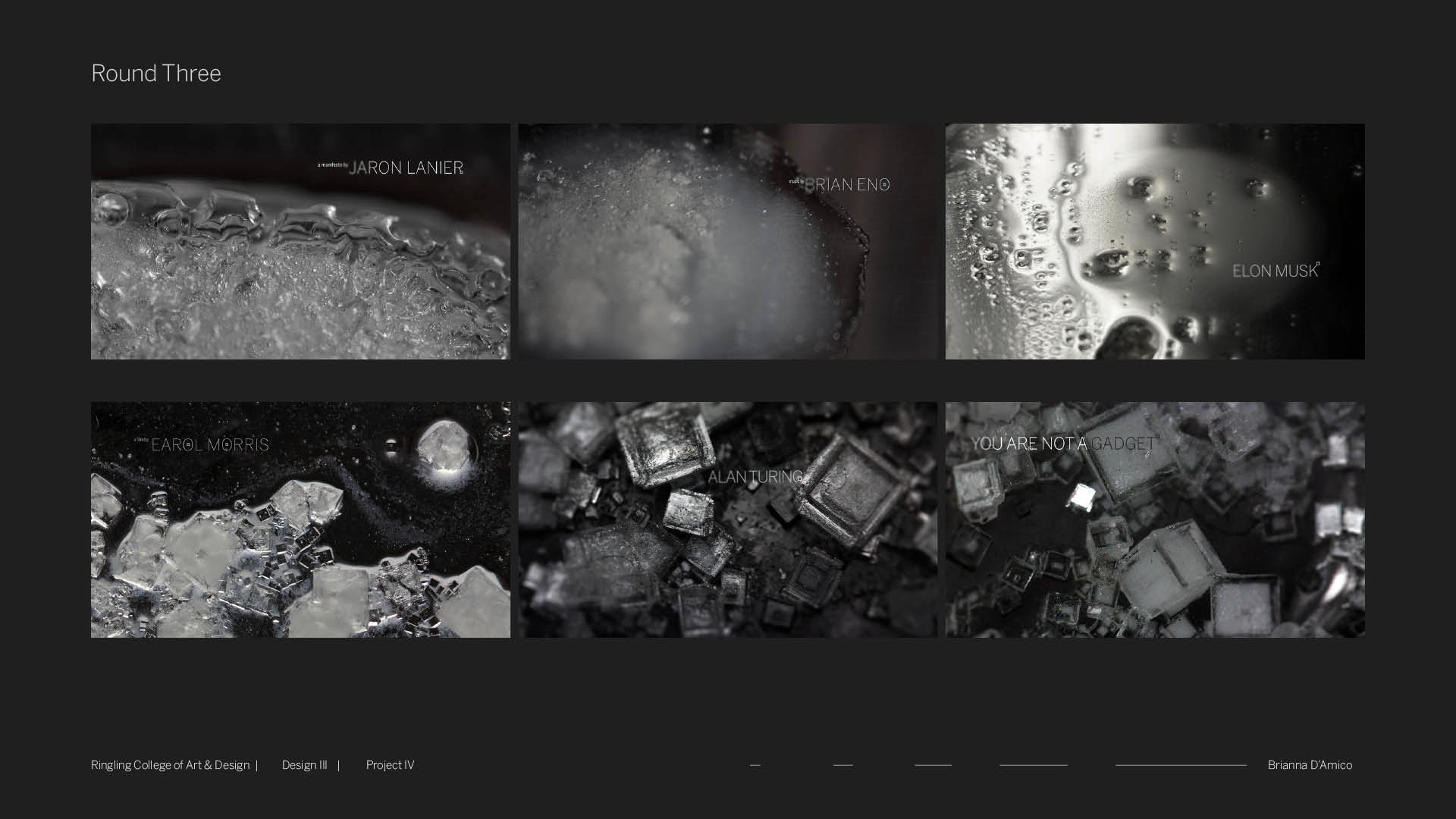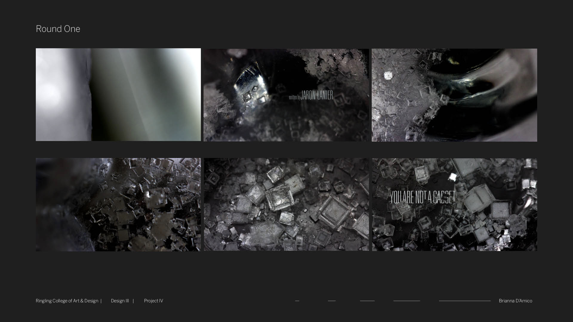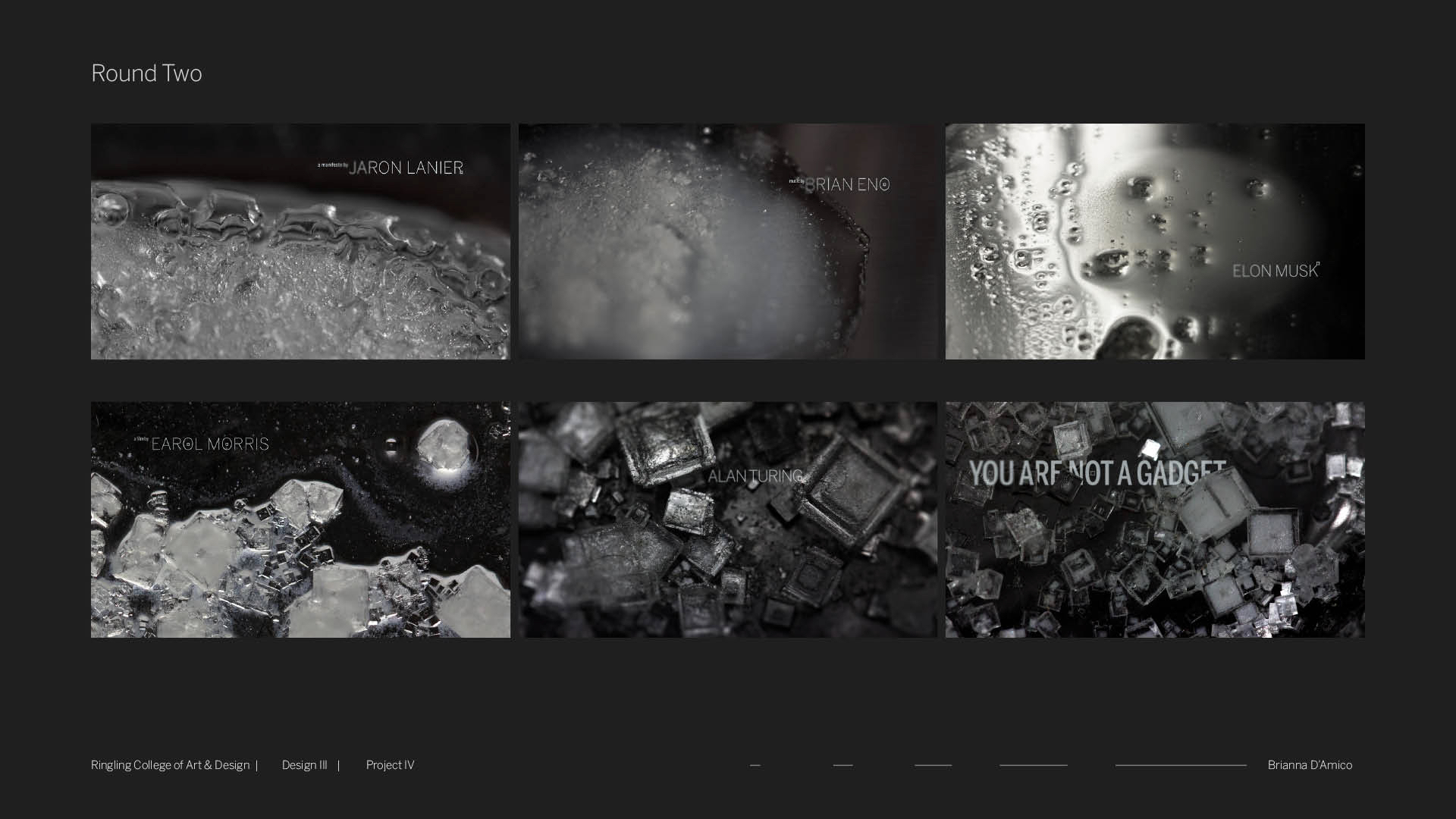 This project is a non-traditional approach to a title sequence, where there are no pre-determined storyboards, and we don’t know what the outcome will be at the start of the project. Students are asked to develop a title sequence for a text about time, nature, or technology. We begin with open-ended visual experiments that resonate with the readings, and continually refine the experiments to enhance their impact and steer the piece towards an intended mood or meaning.